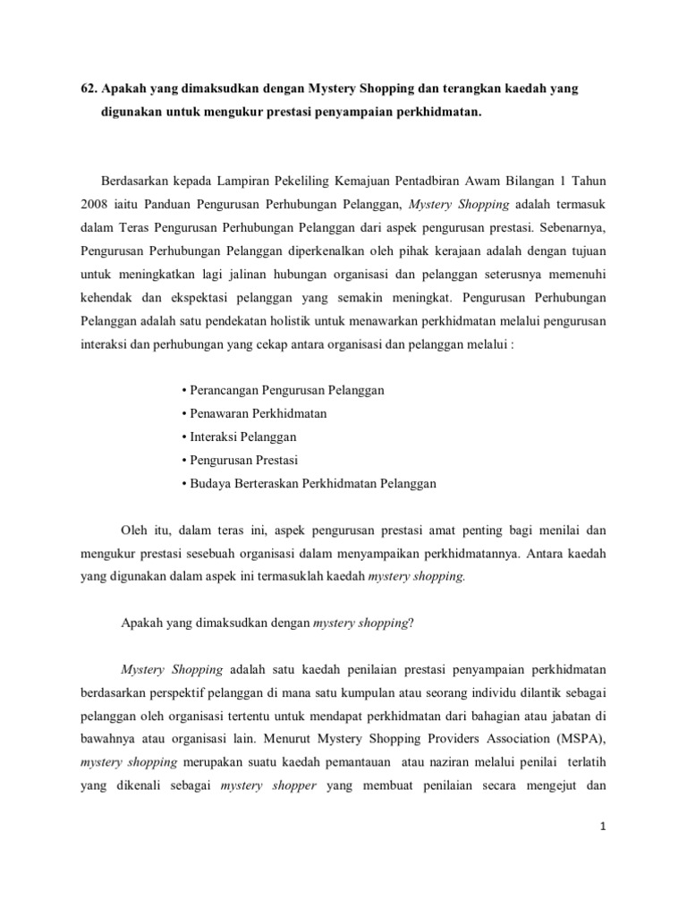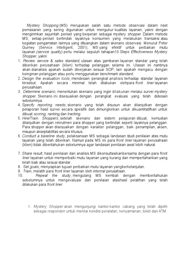 Mystery shopping je kvalitativní metoda výzkumu trhu, která měří maloobchodní kvalitu služeb nebo kdy se získávají informace o produktech a službách vlastní či konkurenční firmy. Pengumpulan data tambahan bisa menggunakan audio atau video juga. Pelajari lebih lanjut tentang mystery shopping dan bagaimana layanan ini dapat mendukung bisnis anda di indonesia. 0 objektif latihan dalam perkhidmatan yang dijalankan bertujuan untuk mencapai objektif yang berikut: 3.1 meningkatkan profesionalisme keguruan 3.2.